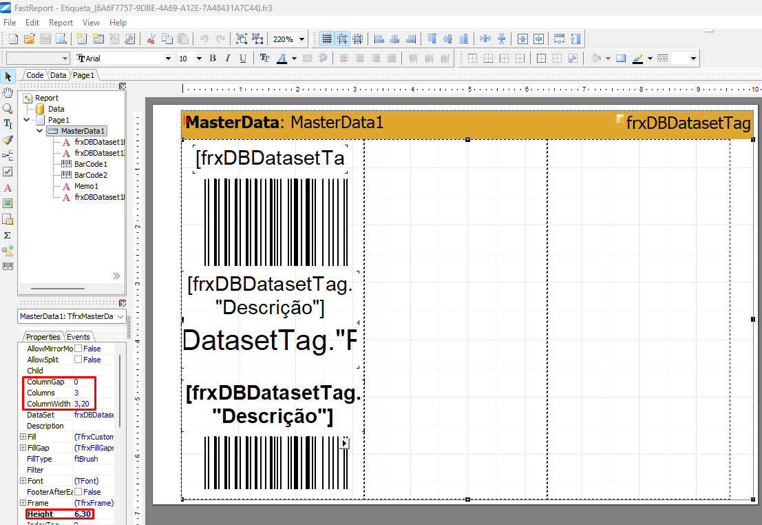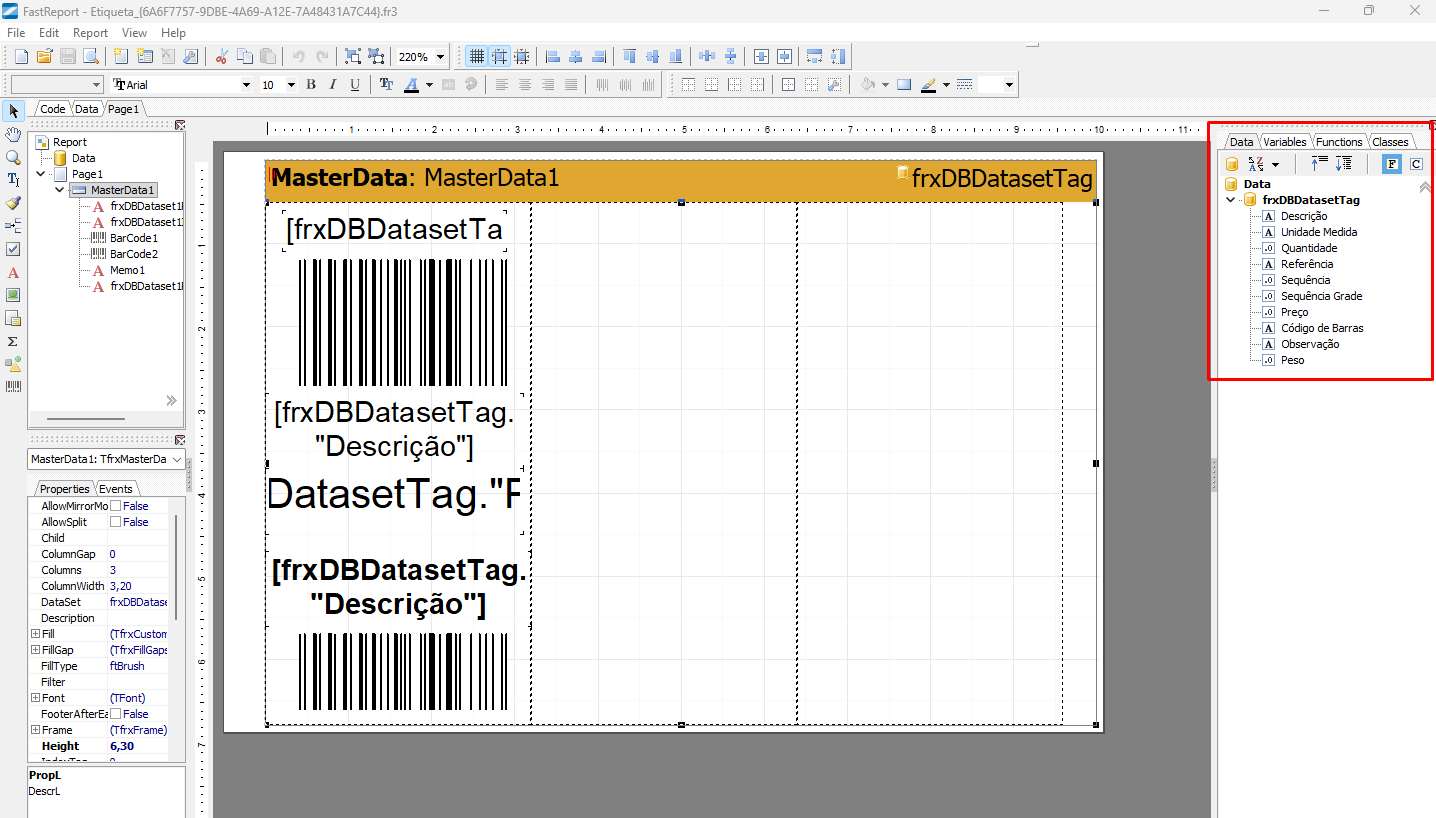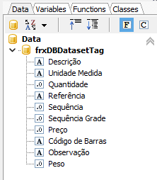 Na parte superior direita da tela, a aba com Data > frxDBatasetTag é apresentada com todas as informações que podem ser adicionadas a etiqueta.