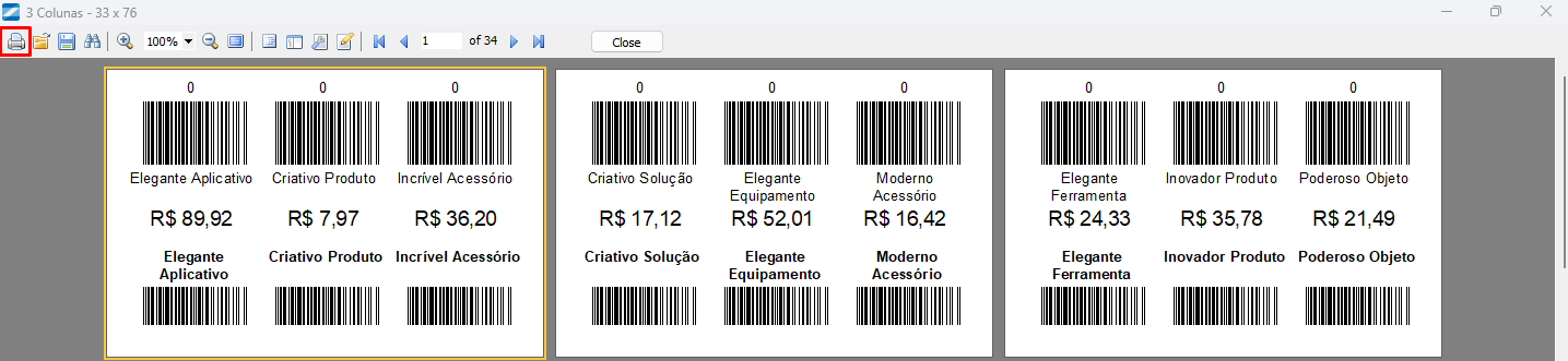 Após definir o tamanho, colunas, informações e código de barras, pode ser pressionado F9 ou CTRL+P no teclado, uma pré visualização da etiqueta será gerada, e, para impressão da etiqueta, selecione o ícone da impressora no canto superior esquerdo.