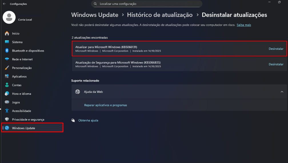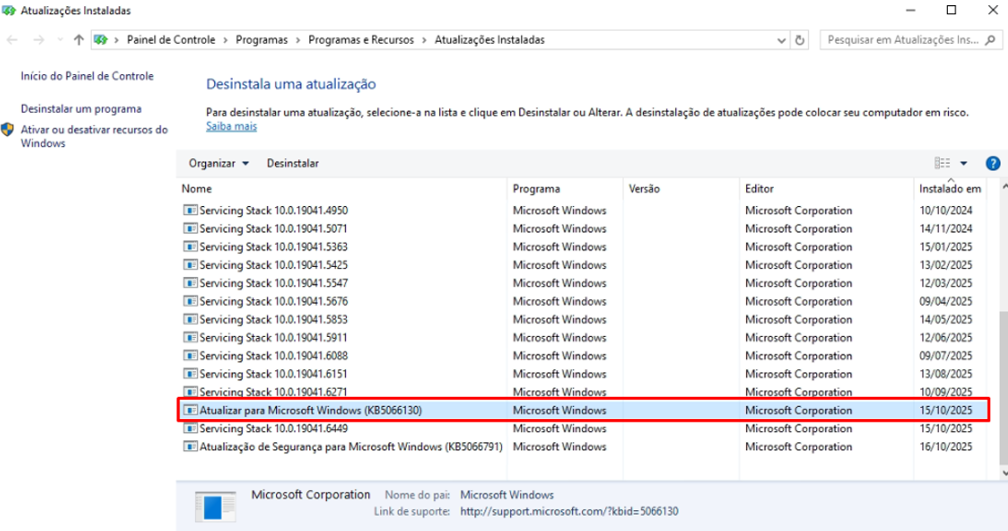 Ao localizar a atualização informada, pressione com o Botão direito > Desinstalar