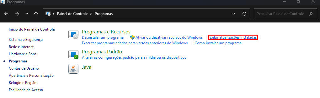 Pressione o botão do Windows na barra de tarefas e digite Painel de Controle > Programas > Exibir atualizações instaladas