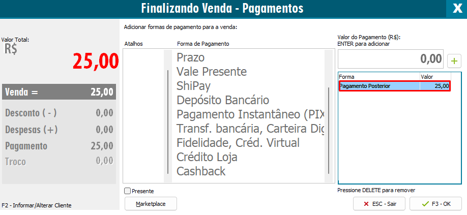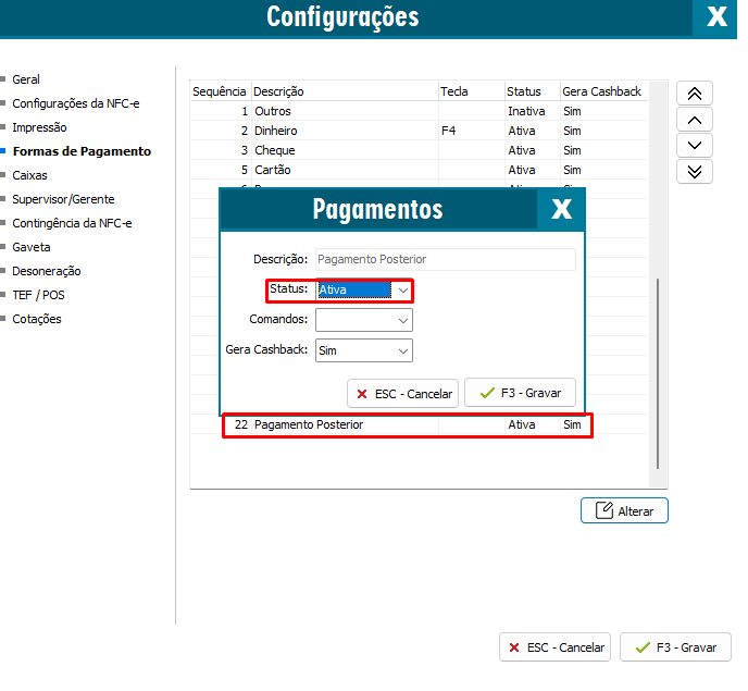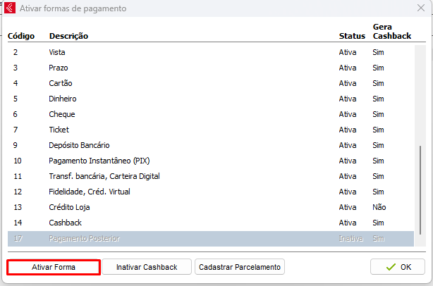 Em seguida, selecione a nova forma de pagamento Pagamento Posterior e marque como Status Ativa