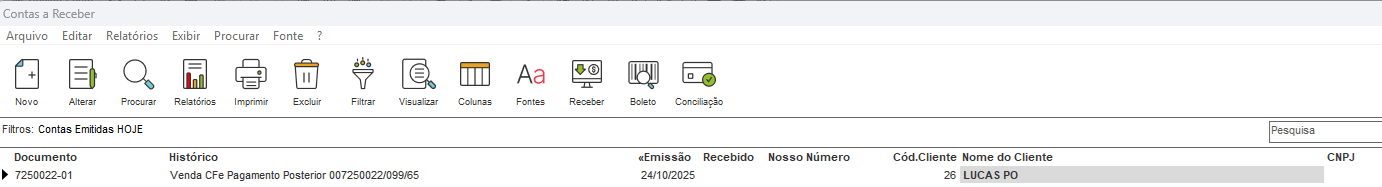 Também será gerado uma Conta a Receber do documento emitido, por se tratar de um pagamento posterior, constará como Não Recebida e será necessário efetuar o recebimento da mesma.