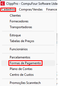 Primeiro, é necessário ativar a forma de pagamento, pode ser realizado no ClippPro > Cadastros > Formas de Pagamento