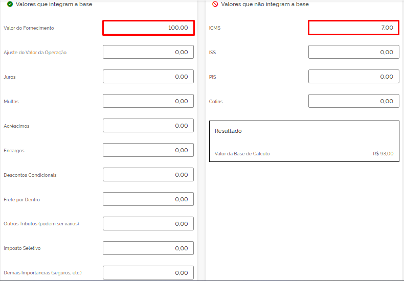 Então considerando que o valor do produto é somado e o valor do ICMS é subtraído, temos 100 – 7, ou seja, valor da Base de Cálculo do IBS e valor da Base de Cálculo do CBS é R$ 93,00. E conforme confirmado pela calculadora da Receita de fato é este valor: