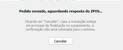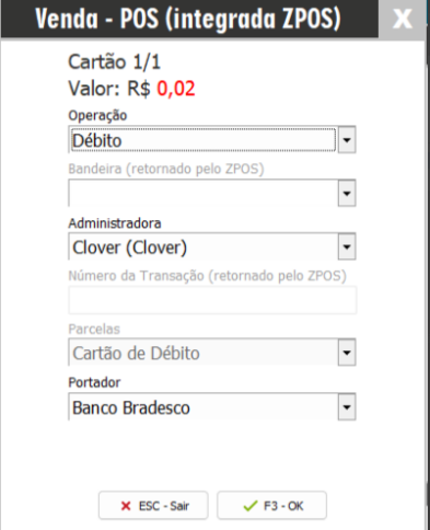 Finalize como cartão, Venda - POS (integrada ZPOS), selecione a administradora cadastrada e clique em OK, uma nova tela será apresentada