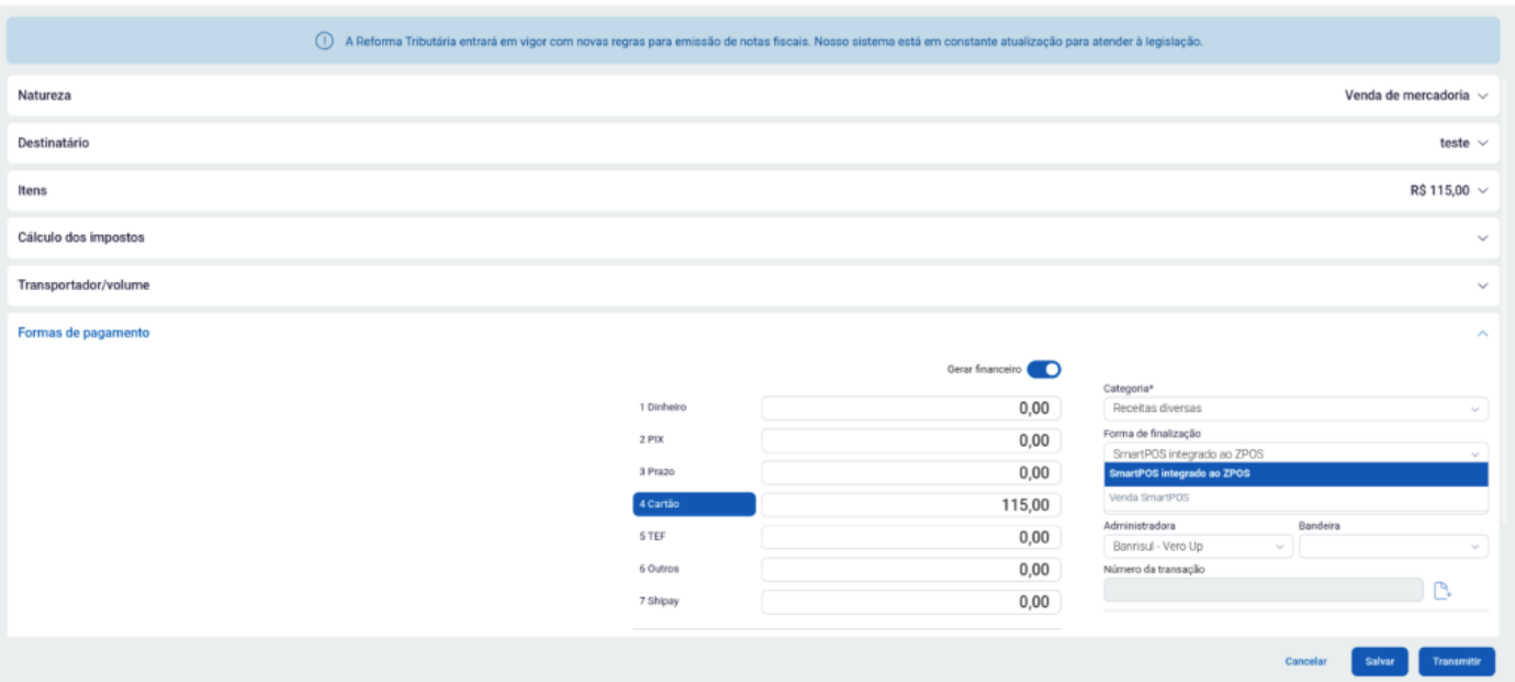O funcionamento se dá da mesma forma como na NFCe, ao selecionar a Forma de Pagamento Cartão e Forma de finalização “SmartPOS integrado ao ZPOS“ Imagem a rotina da maquininha será ativada.
