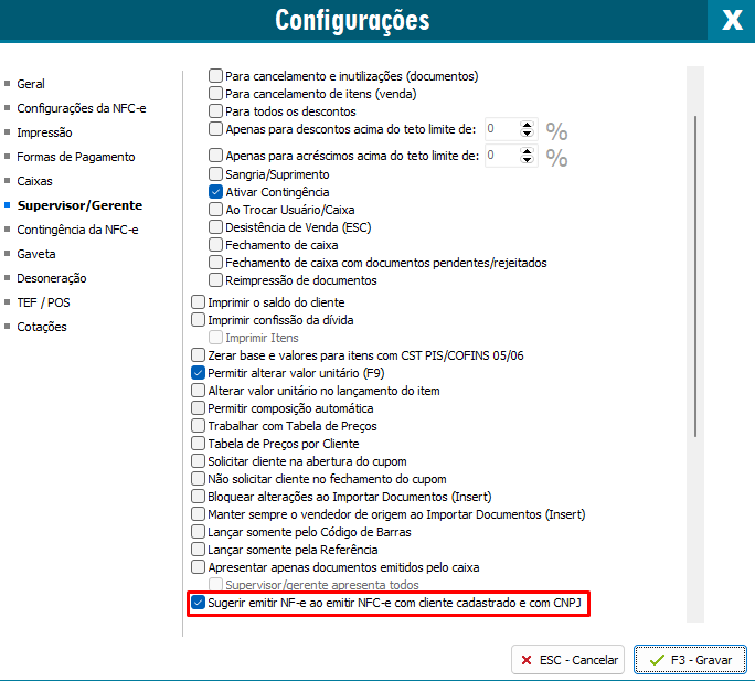 Acesse o NFC-e, clique no botão F10 ou > Supervisor/Gerente > Sugerir emitir NF-e ao emitir NFC-e com cliente cadastrado e com CNPJ