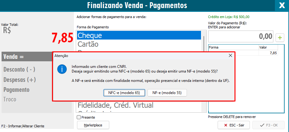 Em seguida, gere um novo documento, ao finalizar a NFC-e adicionando um cliente CNPJ, apresenta a seguinte mensagem: