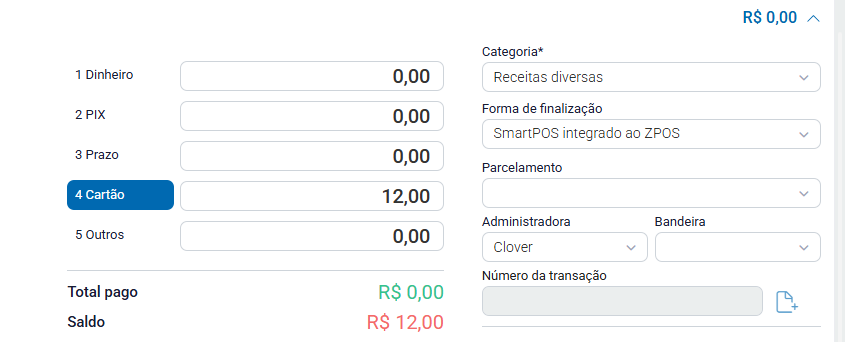 Ao finalizar a venda, selecione a forma de pagamento Cartão > Selecione a forma de finalização como SmartPOS integrado ao ZPOS > Administadora Sicoob - Sipag
