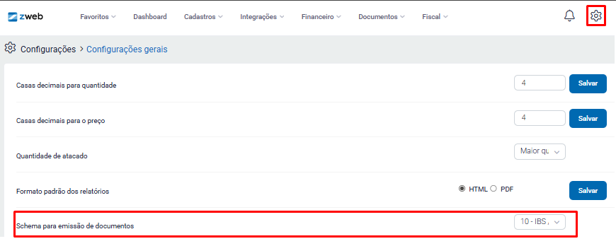 Para apresentar a informação no XML é necessário selecionar o Schema para emissão de documentos: 10 - CBS/IBS em Configurações > Configurações Gerais
