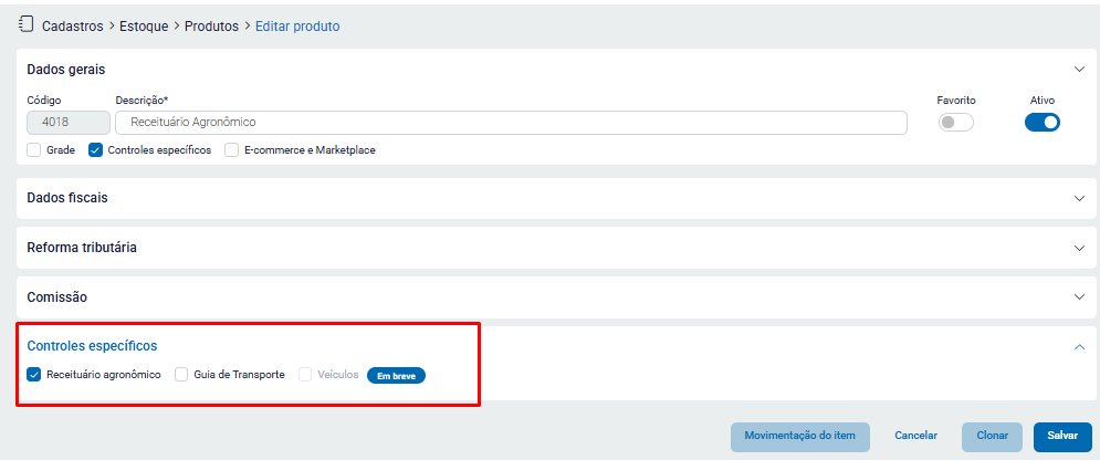 Para utilizar o Receituário Agronômico, acesse Cadastros > Estoque > Produtos > Cadastrar Produto e marque a opção de Controles específicos