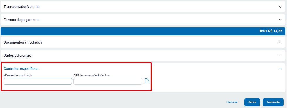 Na última aba, antes da finalização da NFe a nova aba com dados do CPF do resposável e número do receituário serão apresentadas.