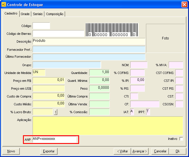 Na opção Estoque 1, preencha ao lado ANP e clique em OK;
