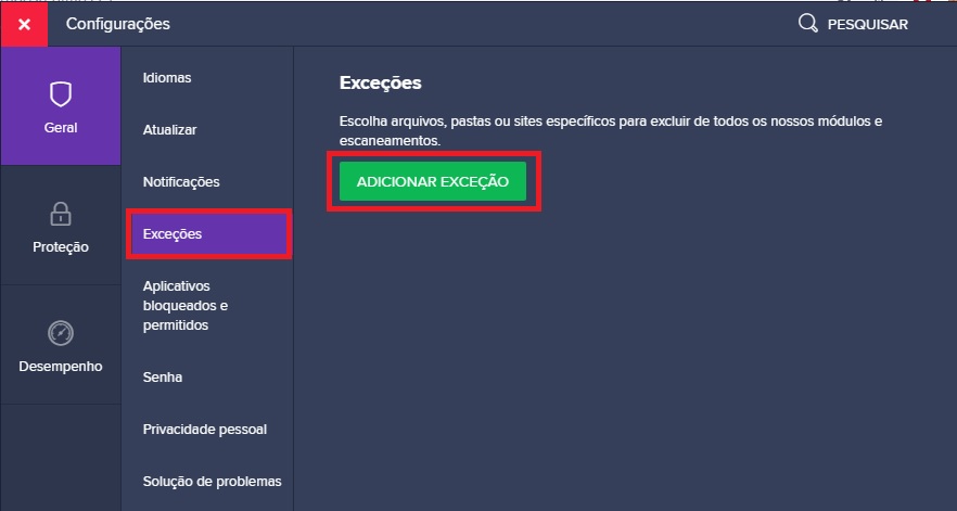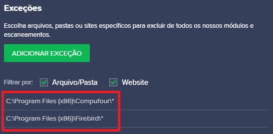 Dentro da interface do antivírus precisará efetuar a configuração de Exclusões. Esta ferramenta permite deixar uma pasta fora do escaneamento dos módulos de proteção do AVAST, neste caso, precisaremos incluir a pasta Compufour às exceções do antivírus.