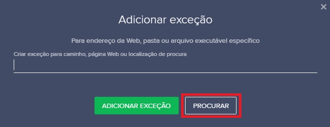Neste momento deve ser selecionada a pasta do sistema e do Firebird para que seja retirada do escaneamento de proteção do Avast. Para iniciar sua configuração, clique em Procurar.