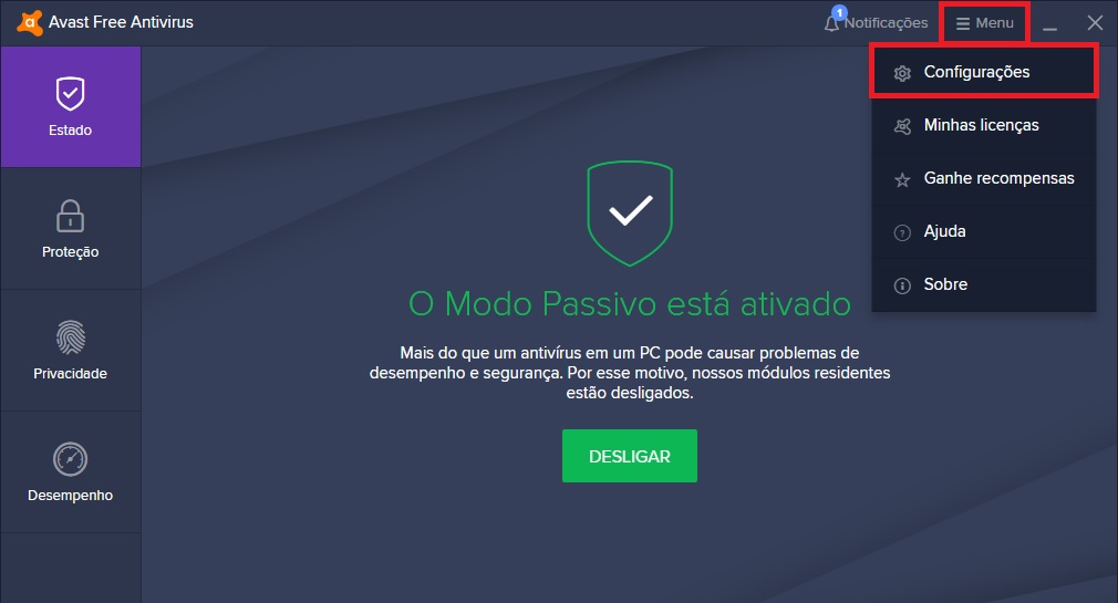 Abra o painel do Avast através do atalho do mesmo em sua área de trabalho ou pela barra de tarefas;