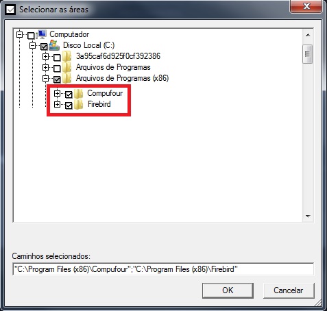 Localize em seu computador a pasta CompuFour onde o sistema está instalado, marque o quadro em branco ao lado do nome da pasta e em seguida faça o mesmo procedimento com a pasta Firebird. Feito isso, clique em OK.