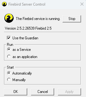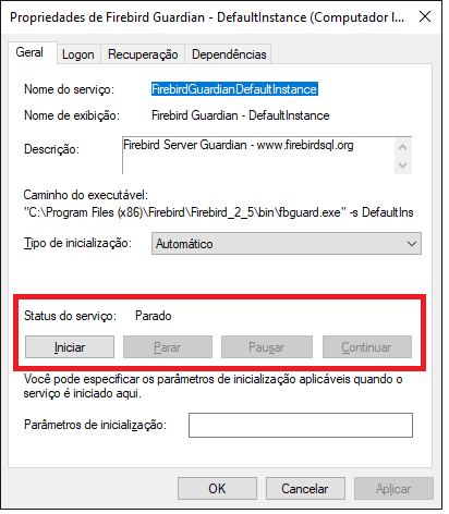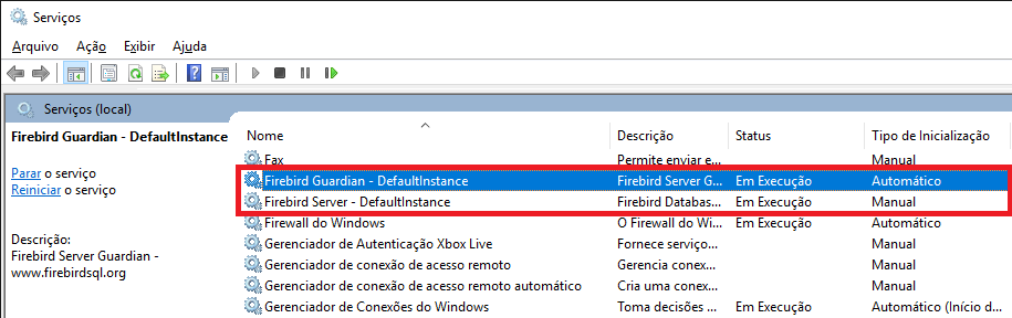 Ambos os serviços (Firebird Guardian e Firebird Server) devem estar com o Status Em Execução. Se algum deles não estiver, clique duas vezes sobre o item e em seguida no botão Iniciar.