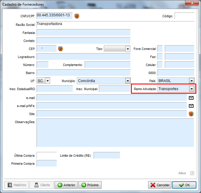 3. Para que o cadastro seja identificado como Transportadora, deve ser selecionado no campo Ramo de atividade a opção Transportes.