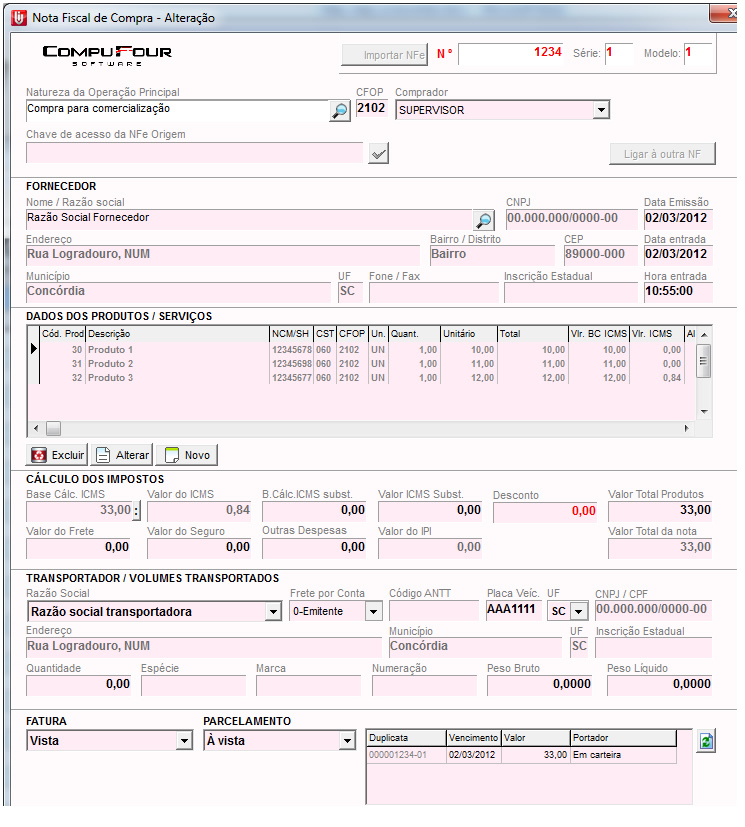 Em seguida será lançada a nota fiscal de compra referente aos itens. Nessa nota será necessário informar os seguintes dados: