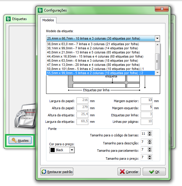 Junto ao assistente de impressão, existem vários modelos de etiquetas pré-configuradas que lhe auxiliam no trabalho de impressão.