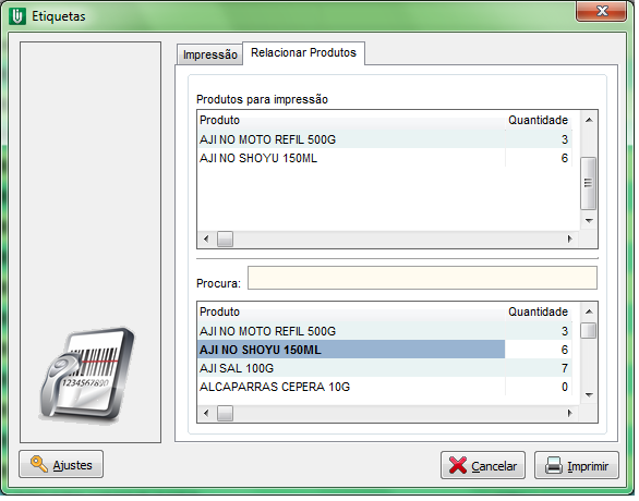Relacionar produtos: esta opção possibilita relacionar produtos para a impressão de etiquetas e a quantidade que será impressa;