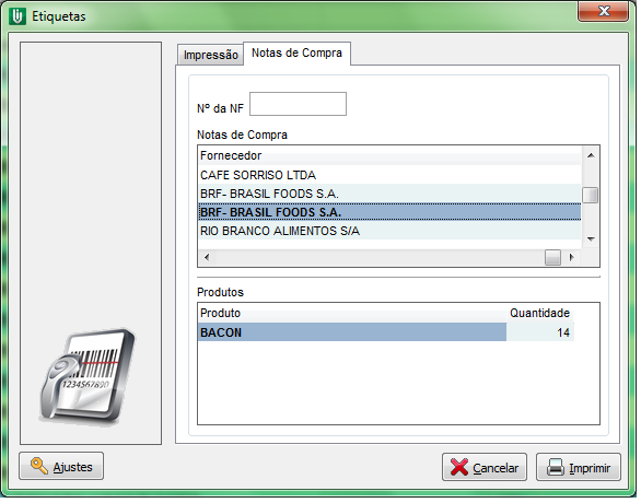 Nota de compra: esta opção exibe a relação das notas fiscais de compra e os produtos comprados, possibilitando imprimir etiquetas e suas quantidades para os produtos desejados;