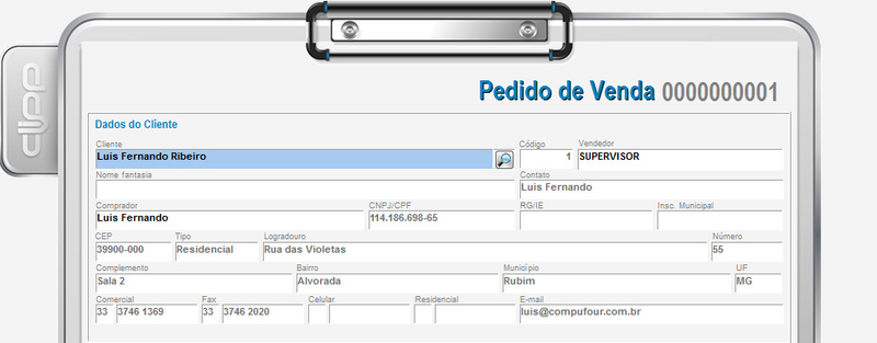 Em primeiro lugar, será necessário informar o cliente previamente cadastrado no sistema e todas as suas informações serão preenchidas automaticamente. O comprador será a pessoa responsável que está solicitando o pedido.