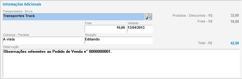 Nas informações adicionais é possível definir antecipadamente qual transportadora fará a entrega da mercadoria, bem como informar o valor do frete. Ainda é possível definir a validade deste pedido e os parcelamentos que poderão ser utilizados após o faturamento.