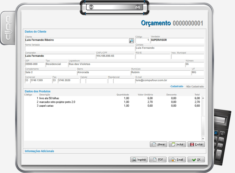 Dentre as opções do orçamento estão todas as listadas acima, para o pedido de venda. Serão informados o cliente, os produtos orçados e suas informações complementares, bem como poderá ser impresso, gerado em PDF ou enviado por email em caso da não utilização da Impressora Fiscal.