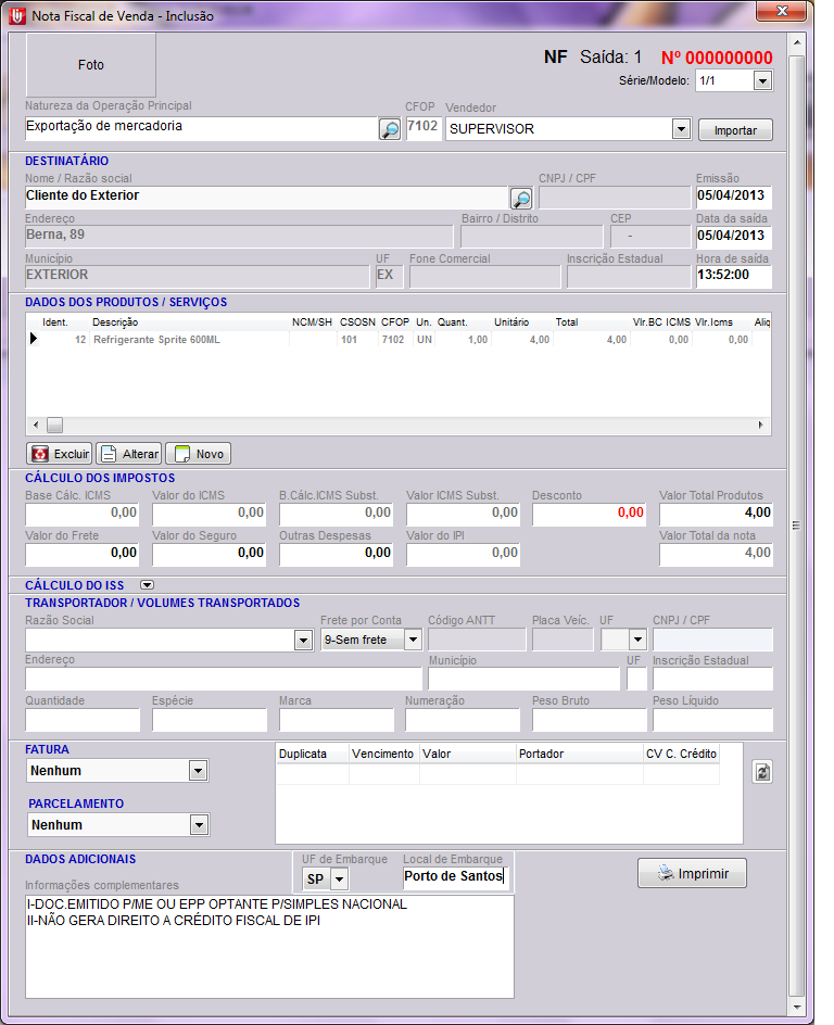 Observação: As Notas Fiscais de exportação não podem ter ICMS, pois este é um imposto nacional. O CST deve ser 041 (Não tributado) e o CSOSN 300 (Imune). Estes códigos CST e CSOSN devem ser preenchidos dentro do cadastro do produto no Modulo de Estoque. Lembrando que o campo CSOSN ficará ativo somente se a empresa estiver configurada como Optante pelo Simples Nacional no Cadastro do Emitente (Modulo de Cadastros > Cadastro do Emitente), neste caso este campo é obrigatório junto com o CST. Se a empresa não for Optante pelo Simples Nacional deverá preencher somente o CST.