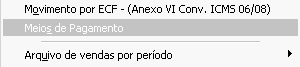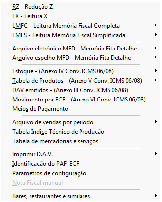Nesse menu são apresentadas todas as funções fiscais da Impressora Fiscal, como relatórios gerenciais gerados pela impressora, identificação da PAF-ECF, Nota Fiscal manual, DAV's entre outros relatórios.