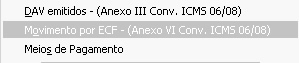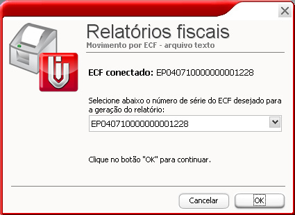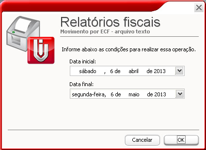 Movimento por ECF - No relatório de Movimento por ECF será gerado um relatório das movimentações feitas no ECF. Poderá ser indicado o período da movimentação e de qual impressora deseja gerar o arquivo caso tenha mais do que uma liberada.