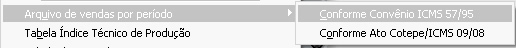 Arquivo de Vendas por período - Possui duas opções, o relatório conforme Convênio ICMS 57/95 onde irá gerar o arquivo Sintegra e também conforme o Ato Cotepe/ICMS 09/08 onde irá gerar o arquivo do Sped Fiscal.