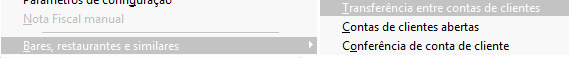 Na opção de Transferência entre contas de clientes é possível transferir a conta de uma mesa para outra, isso pode ocorrer no caso do cliente trocar de mesa por exemplo. Então ao selecionar essa opção no emissor de cupom fiscal vai ser impressa as transferências entre as mesas.