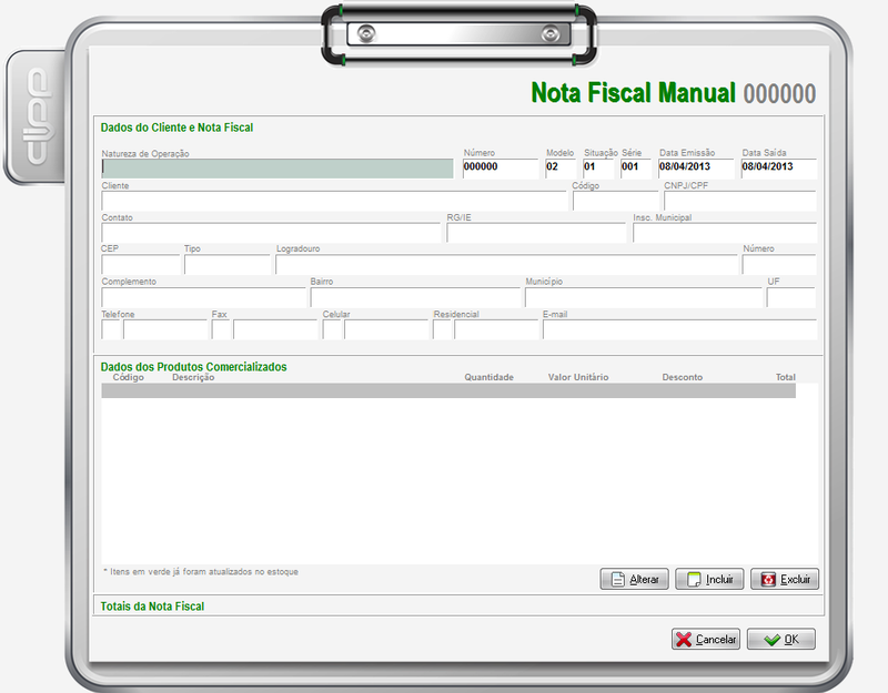Na nota fiscal manual deverá lançar a natureza de operação desejada (a mesma deve estar cadastrada no Clipp Store), após informe o Número, Modelo, Situação, Série e data da nota em questão (o modelo nesse caso sugerimos que seja modelo 02, com base nos manuais atuais é o modelo a ser usado. Sugerimos que da mesma forma seja consultado o contador da empresa) após informe o cliente, os itens e as demais informações necessárias.