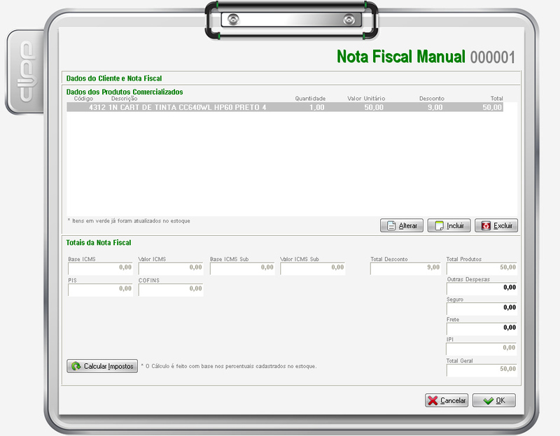 Poderá ser lançado o produto mesmo não tendo quantidade disponível em estoque, porém este não poderá ser atualizado posteriormente. Nesse módulo não será permitido Acréscimos, apenas descontos. Concluída o lançamento clique em OK. Após o lançamento dos itens, caso for necessário que sejam calculados impostos na venda, deve clicar em Calcular Impostos, tudo isso será baseado nas informações do cadastro do produto no estoque e do cadastro da natureza de operação.