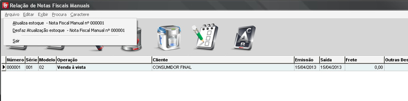 Pronto! Está criada a nota manual, porem os produtos lançados nessa nota ainda constam no estoque, para que o estoque fique correto será necessário atualizar os dados referente a essa nota. Para isso selecione a nota, acesse o menu Arquivo / Atualiza estoque – Nota Fiscal Manual nº 000001.
