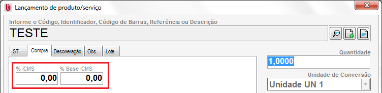 - Deve verificar os campos % ICMS e % Base ICMS;