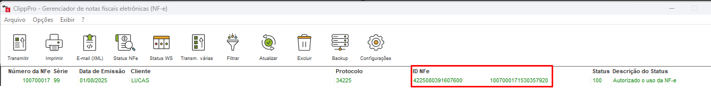 - Abra o Gerenciador de NFe, clique duas vezes sobre a chave de acesso da nota até que ela fique selecionada e copie o Número de Identificação da Nota Fiscal (ID NFe);