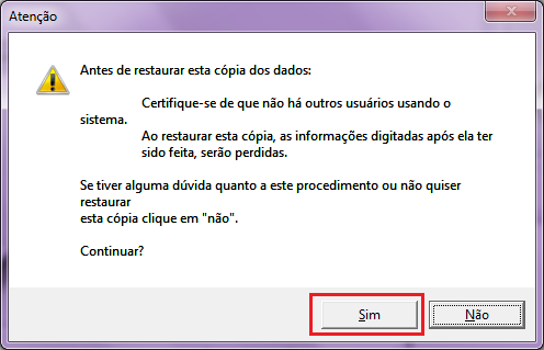 Irá mostrar uma tela de aviso, solicitando a confirmação se realmente deseja restaurar o backup, clique em Sim.