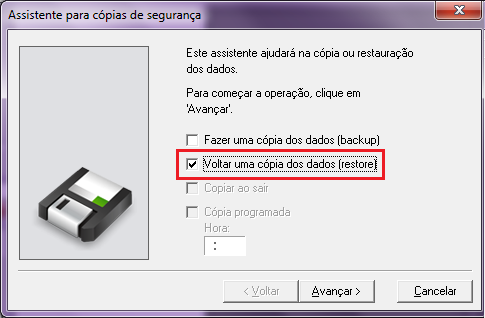 Marque apenas a opção “Voltar uma cópia dos dados (restore)” e clique em Avançar.