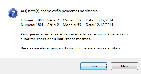 Portanto, quando apresentada essa mensagem, deverá cancelar a geração do arquivo e efetuar os ajustes necessários, ou seja, todas as notas pendentes devem ser autorizadas, canceladas (caso já estejam autorizadas) ou inutilizadas (caso não estejam autorizadas).