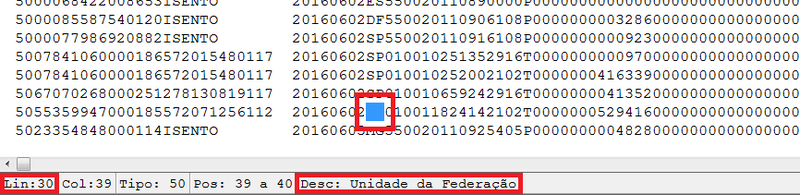 Automaticamente o cursor estará no primeiro campo da linha solicitada. Poderá ter como base, na barra de status do validador, a opção "Desc:", como mostra a imagem abaixo, esta informação indica ao que se refere o campo selecionado, neste caso o campo selecionado é a Unidade da Federação (UF).