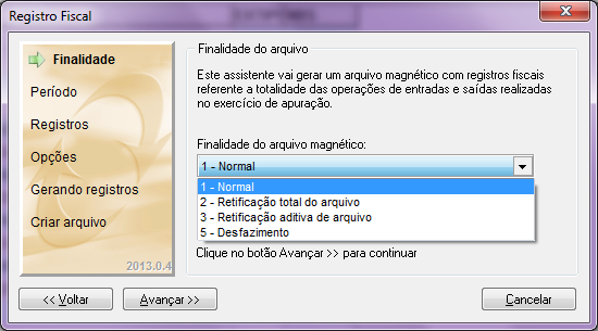 Em seguida conforme orientação do contabilista é necessário selecionar a finalidade do arquivo que pode ser: