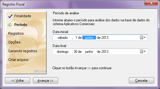 Após, é necessário selecionar o período desejado. O período a ser gerado deve seguir a orientação do contador, é sempre mensal, e deve iniciar com o primeiro dia do mês solicitado, e finalizar com o ultimo dia do respectivo mês. Geralmente é gerado utilizando o período referente do mês anterior ao movimento atual.