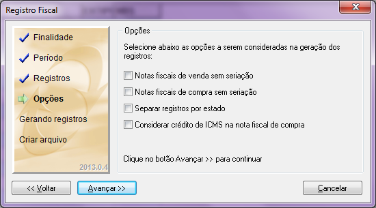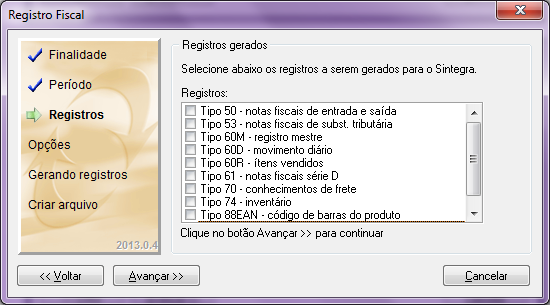 Ao clicar em Avançar, será necessário selecionar os registros que serão gerados. Cada registro é responsável por dados específicos de entrada ou saída, para saber quais são os registros que devem ser marcados é necessário verificar com o contabilista responsável.