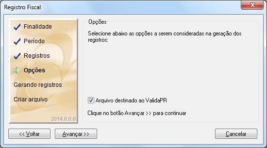 Quando o arquivo do Sintegra for importado para o ValidaPR, durante a geração do arquivo deverá marcar a opção “Arquivo destinado ao ValidaPR”, conforme indicado abaixo: