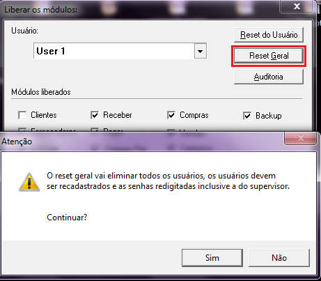 Para excluir todos os usuários e senhas, acesse o módulo Supervisor e clique em “Reset Geral”, apenas o usuário Supervisor não será eliminado, sendo que sua senha também deverá ser recadastrada.