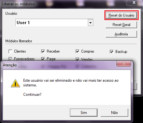 Para excluir o usuário, acesse o módulo Supervisor, selecione o usuário que queira excluir e clique no botão “Reset do Usuário”, após, clique em “Sim” para confirmar a operação.